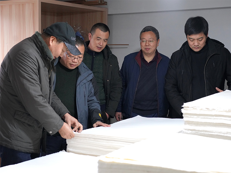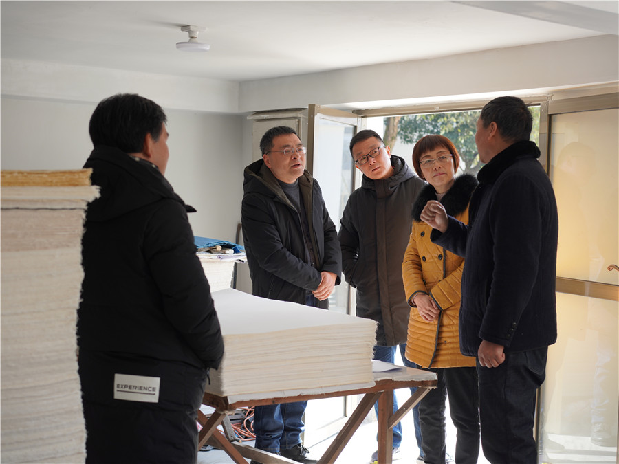 2021年1月26日,休寧縣政協(xié)主席儲(chǔ)曉華來(lái)公司調(diào)研徽州楮皮紙制作技藝傳承和發(fā)展情況。