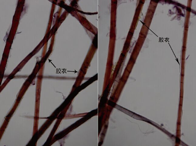 在200 倍鏡下,可觀察到構(gòu)皮纖維具有明顯的細(xì)胞腔,但細(xì)胞腔大小不一。細(xì)胞壁上的橫節(jié)紋愈加明顯清晰,紋理深淺各異,大多數(shù)橫節(jié)紋跟纖維橫切面約成15~20°的夾角。部分纖維細(xì)胞的外壁包裹有一層透明膜,稱為膠衣(如圖3),一般多呈斷續(xù)狀,并會隨著纖維被處理程度的加重而減少,有些甚至被剝離成碎片飄散于纖維之間,在纖維的端部膠衣相對比較明顯。
